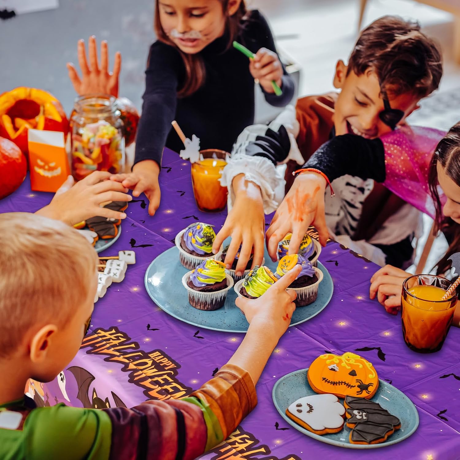 Creëer in een handomdraai een griezelige Halloweensfeer aan tafel. Deze set van 2 plastic tafelkleden is versierd met vleermuizen, pompoenen en enge ogen in paarse tinten. Gebruik ze binnen of buiten om je feesttafel te beschermen én meteen stijlvol te decoreren.